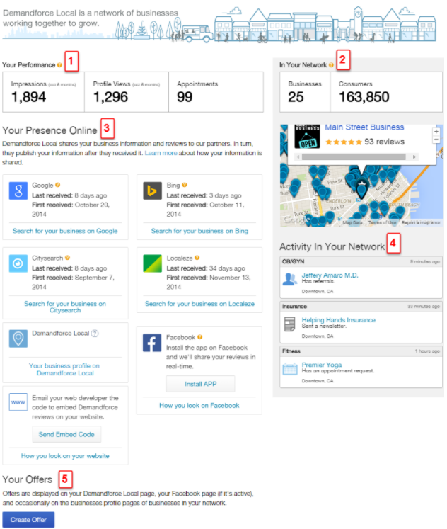 Demandforce Local is a searchable directory designed to increase your online visibility and allow consumers in your local area to discover your business. All the network activity Patient Engage generates for you is tracked.