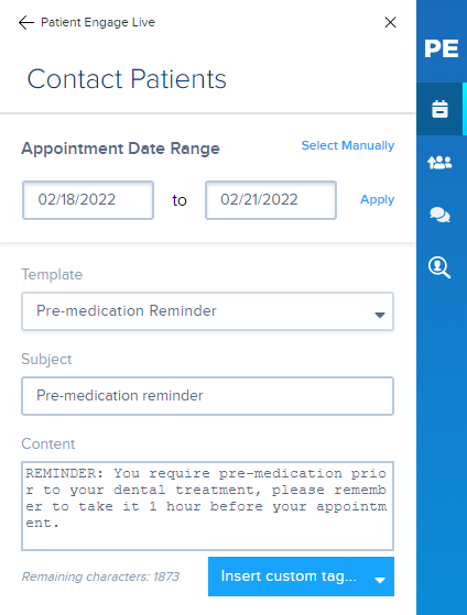 4. Under Appointment Date Range, type the appointment date range for the patients you want to contact (or select the dates from the drop-down calendar), and then click Apply.