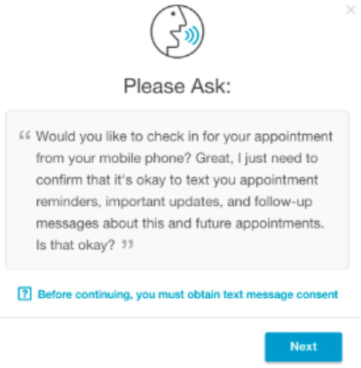 2. Get verbal consent from the patient to complete the Check In for their appointment via mobile phone, and then click Next.