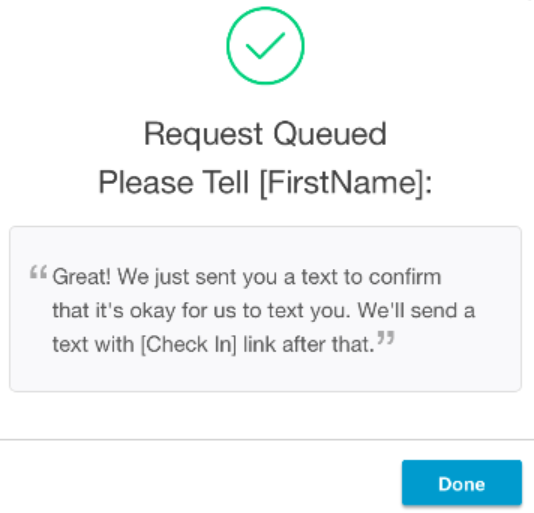 Note: If the patient has already opted in to text communication, the Check In link will be sent once you've clicked the Check In button, and the patient will neither receive nor have to reply to the opt-in text. Patients must be opted in completely to text communications prior to receiving the Check in link.